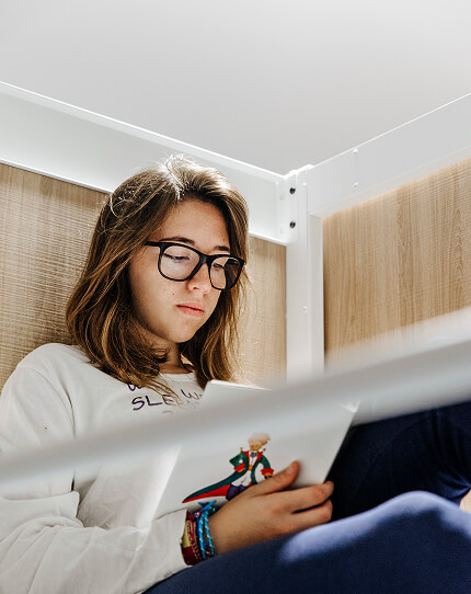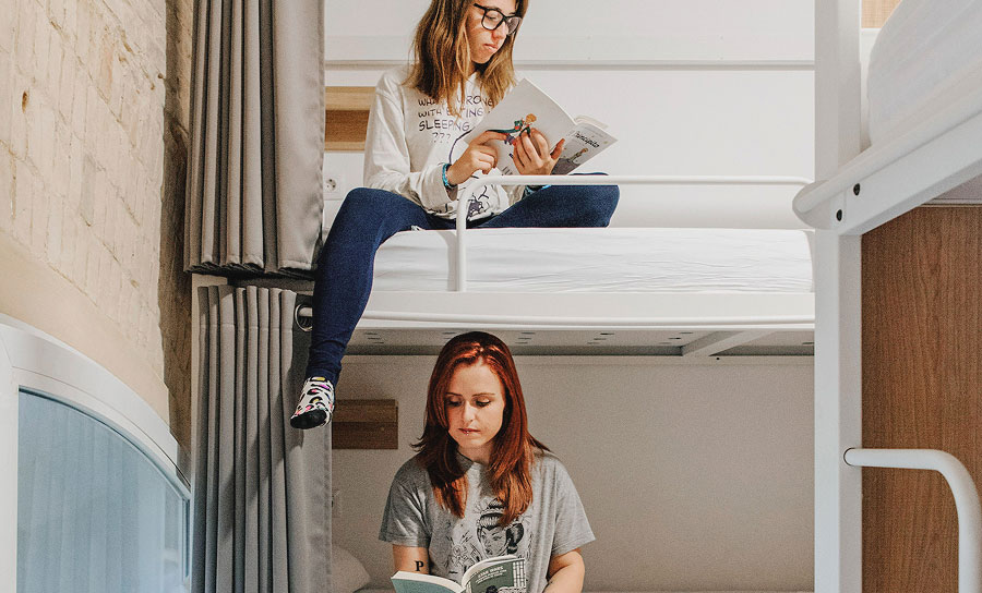 Todo lo que hace falta para descansar bien: camas con cortina, luz y enchufe propio, taquillas seguras y zonas comunes donde siempre